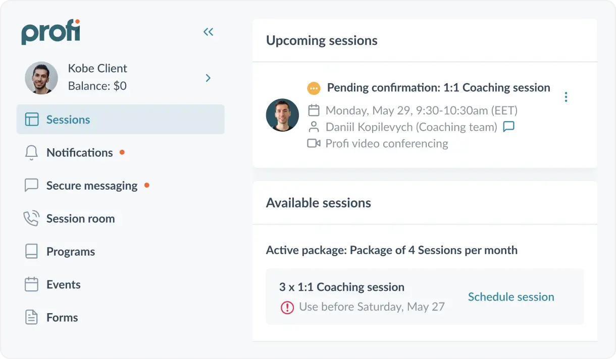 Why spend your valuable time on administrative tasks when you could be helping clients? Profi's health coaching software allows you to prioritize client care and gives you enhanced control over scheduling, client management, billing, and more.