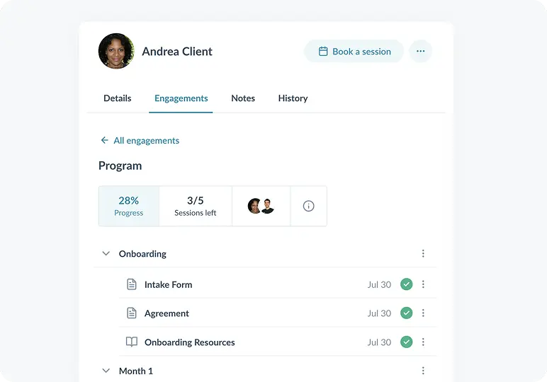 One intuitive portal where clients can engage with you, access shared resources, schedule coaching sessions, track progress, pay and auto-renew.