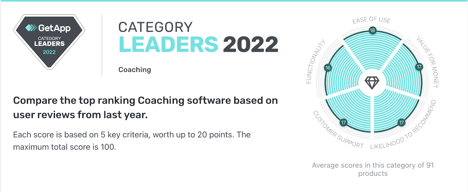 What makes us a coaching software category leader according to GetApp? We’re in the top 15 of 91 coaching software apps, with an average rating of 4.8 out of 5 stars! And we’ve scored 91 out of 100 total score in a comparison of top-ranking North American coaching software across these five key areas: